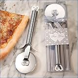 These heart design stainless steel pizza cutter favors are a real slice of heaven When the moon hits your eye like a big pizza pie - that's amore! And it's sure to be love when your guest lay there eyes on these playful but useful pizza cutter favors. Each measures 8 ½" x 2 ½" x ¾" and features sturdy stainless steel construction with heart design details at the tip of the handle and at the center of the circular blade. From the "Amore Stainless Steel" collection, each comes attractively packaged in a signature clear plastic display box with a silver, black and white striped insert base, wrapped with a heart design "For You" sleeve and a white organza bow.Read Full Product Specification here